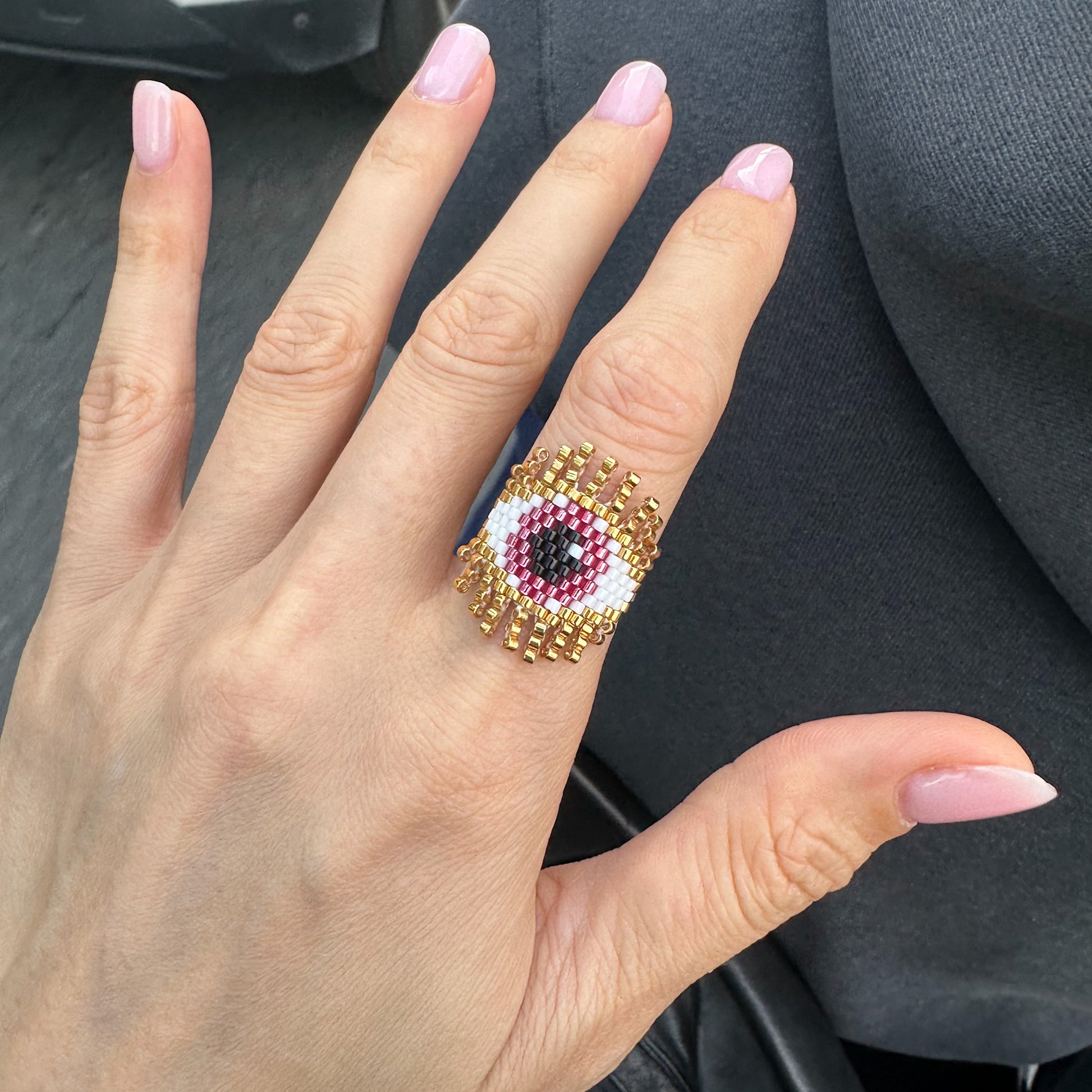 Looking for a one-of-a-kind accessory that will turn heads and captivate attention? Look no further than our New style Evil Eye RIng! Best seller and absolutely unique, this rings handmade by our small team in Bangkok. We use glass seed beads from Japan brand name MIYUKI Delica series. The gold beads are plated with real 24 carat gold. Silver beads are coated with palladium. Yes, glass seed beads can be coated with precious metals, that’s why we love Miyuki. We take pride in creating handmade pieces, as they carry a unique charm that cannot be replicated by mass-produced items. Each ring is crafted with attention to detail, guaranteeing that you'll own a truly exceptional piece of jewelry.