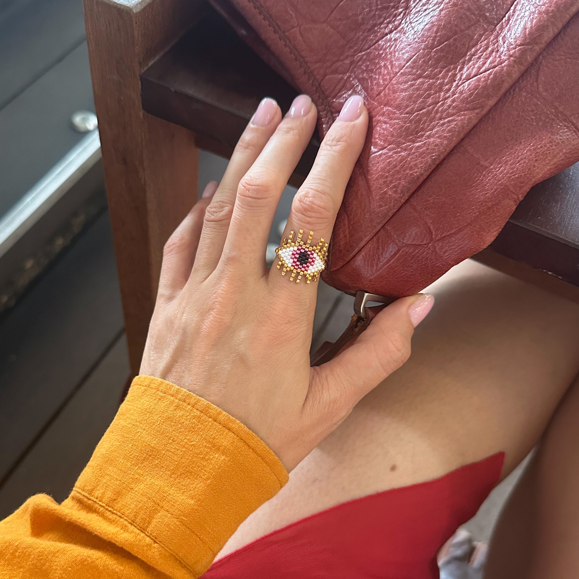 Looking for a one-of-a-kind accessory that will turn heads and captivate attention? Look no further than our Evil Eye Ring! Best seller and absolutely unique, this ring handmade by our small team in Bangkok and Milan. We use glass seed beads from Japan brand name MIYUKI, Delica series. The gold beads are plated with real 24 carat gold. Silver beads are coated with palladium. Yes, glass seed beads can be coated with precious metals, that’s why we love Miyuki. We take pride in creating handmade pieces, as they carry a unique charm that cannot be replicated by mass-produced items. Each ring is crafted with attention to detail, guaranteeing that you'll own a truly exceptional piece of jewelry.